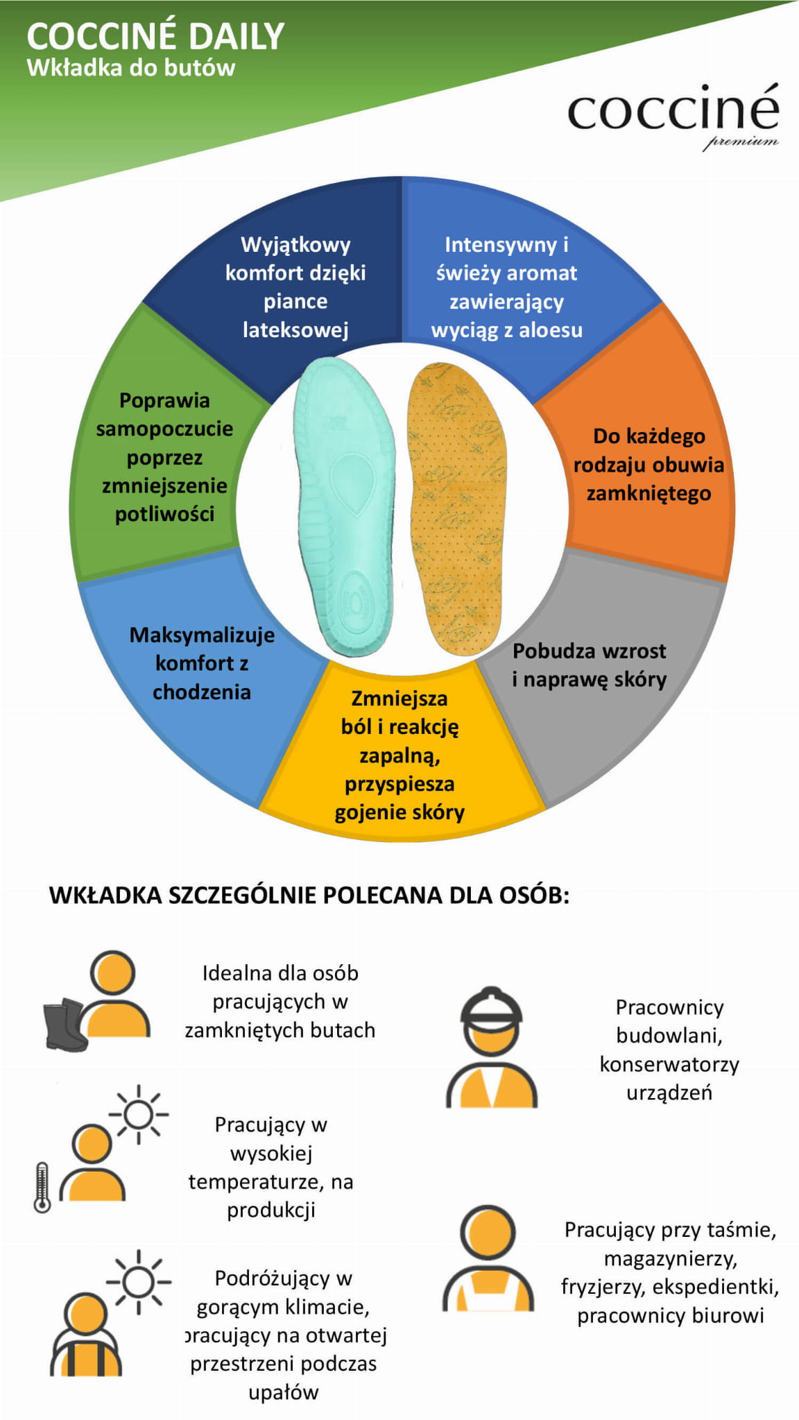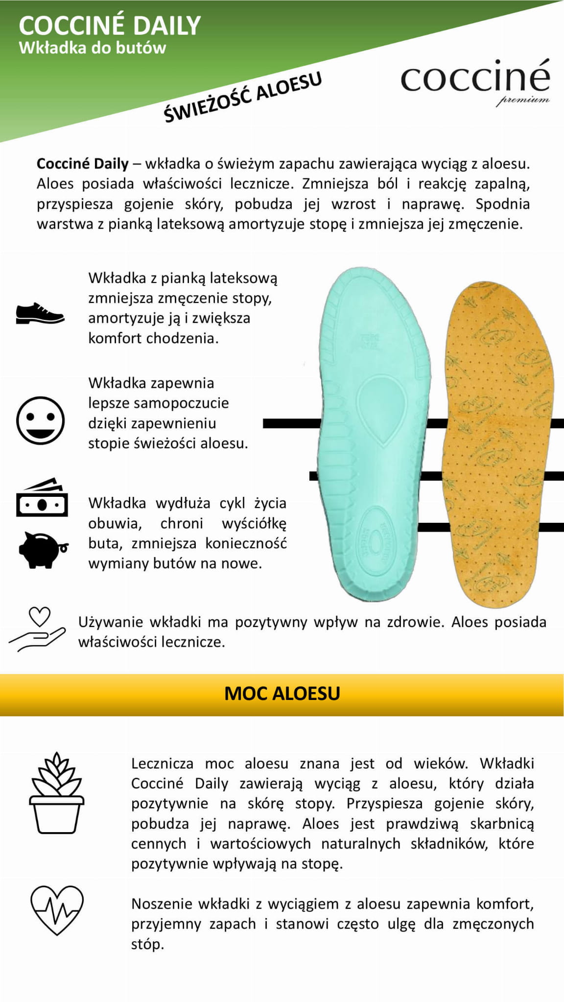 • Używanie wkładki do butów ma pozytywny wpływ na zdrowie. Aloes posiada właściwości lecznicze.