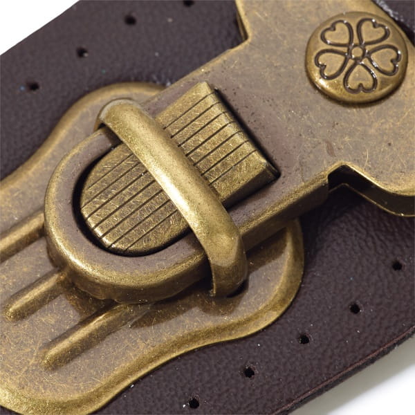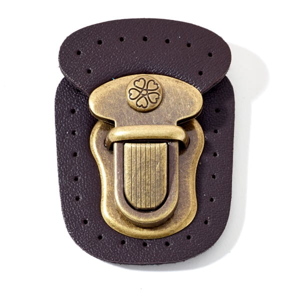 Blokada zakładki składa się z dwóch części: dolna część znajduje się na ciemnobrązowej naszywce z imitacji skóry, górna część jest również przymocowana do przyszywanej płyty.